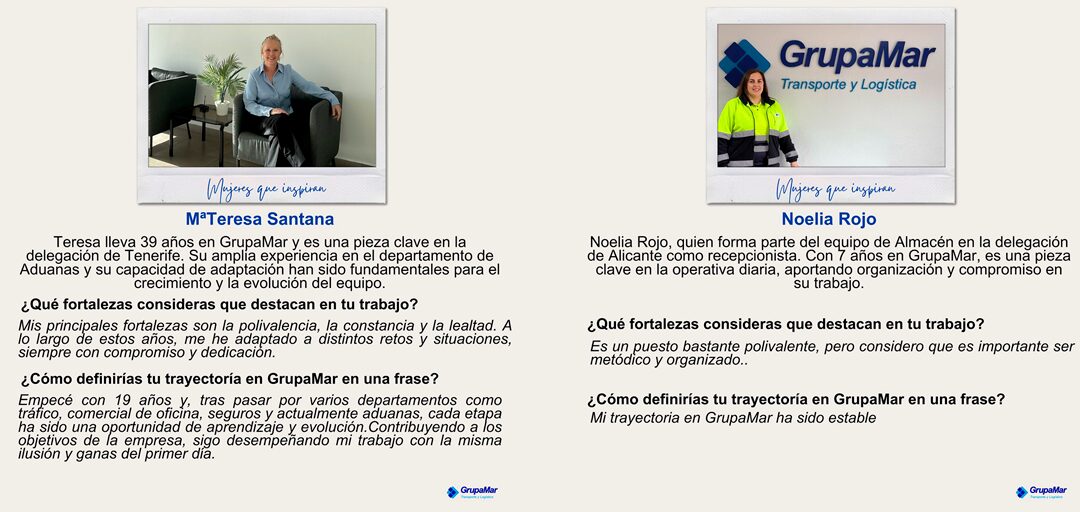 Presentamos dos mujeres cuya profesionalidad y entrega las convierten en referentes dentro de GrupaMar: Teresa Santana, del departamento de Aduanas en la delegación de Tenerife, y Noelia Rojo, del equipo de Almacén de la delegación de Alicante.